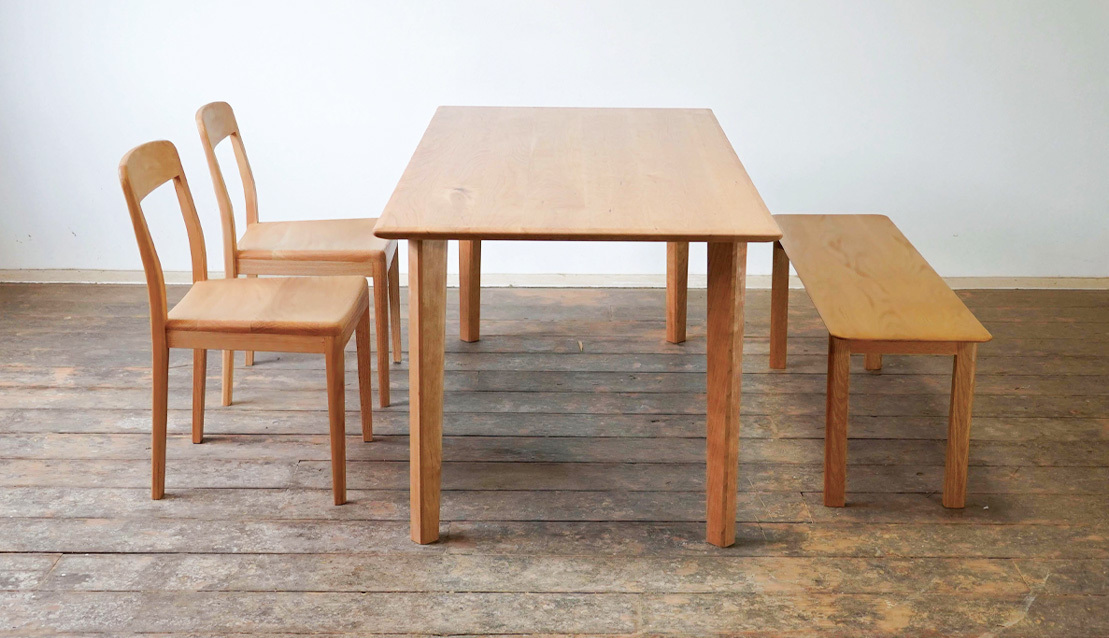 テーブル天板同様に、座面板端面に向かってテーパーをつけて削り出し、全体を柔らかな曲面で仕上げることで、席についた際の居心地の良さと、ソフトで軽快な印象を演出しています。また、テーブル天板の大きめのアールで仕上げた四角と同様にベンチも同様のデザインとなっており、セット使用時の統一感を演出しています。